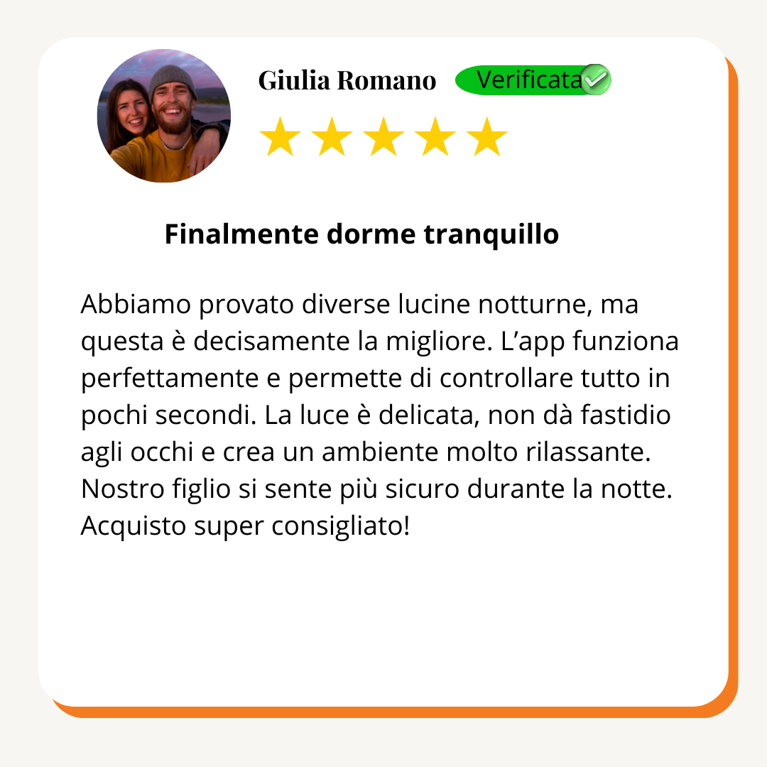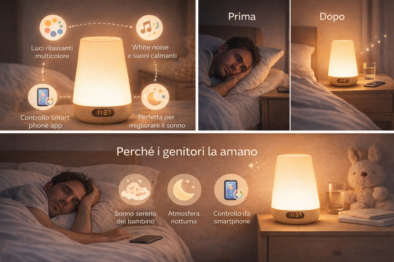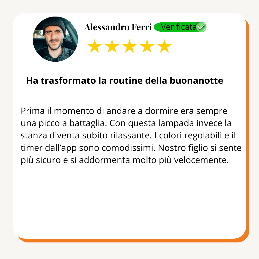 "Con la luce giusta che si diffonde delicata, il sonno arriva più in fretta, e l’intera stanza respira calma. Guardi chi ami addormentarsi sereno e scopri che la notte può davvero diventare un abbraccio condiviso"
