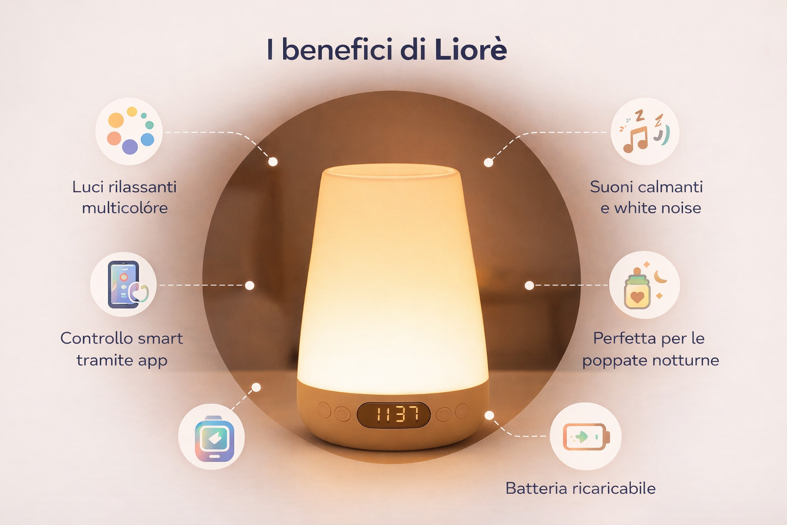Liorè non è solo una lampada. Combina luci rilassanti multicolore, suoni calmanti e controllo smart, creando un ambiente che aiuta davvero a rilassarsi e prepararsi alla notte.